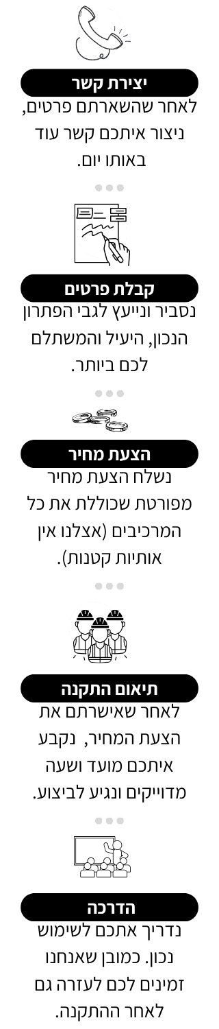 אנחנו בעלי הסמכה של קבלן רשום ומתקין מורשה, תהנו ממערך התמיכה המעולה שלנו וזמינות גבוהה לכל שאלה.